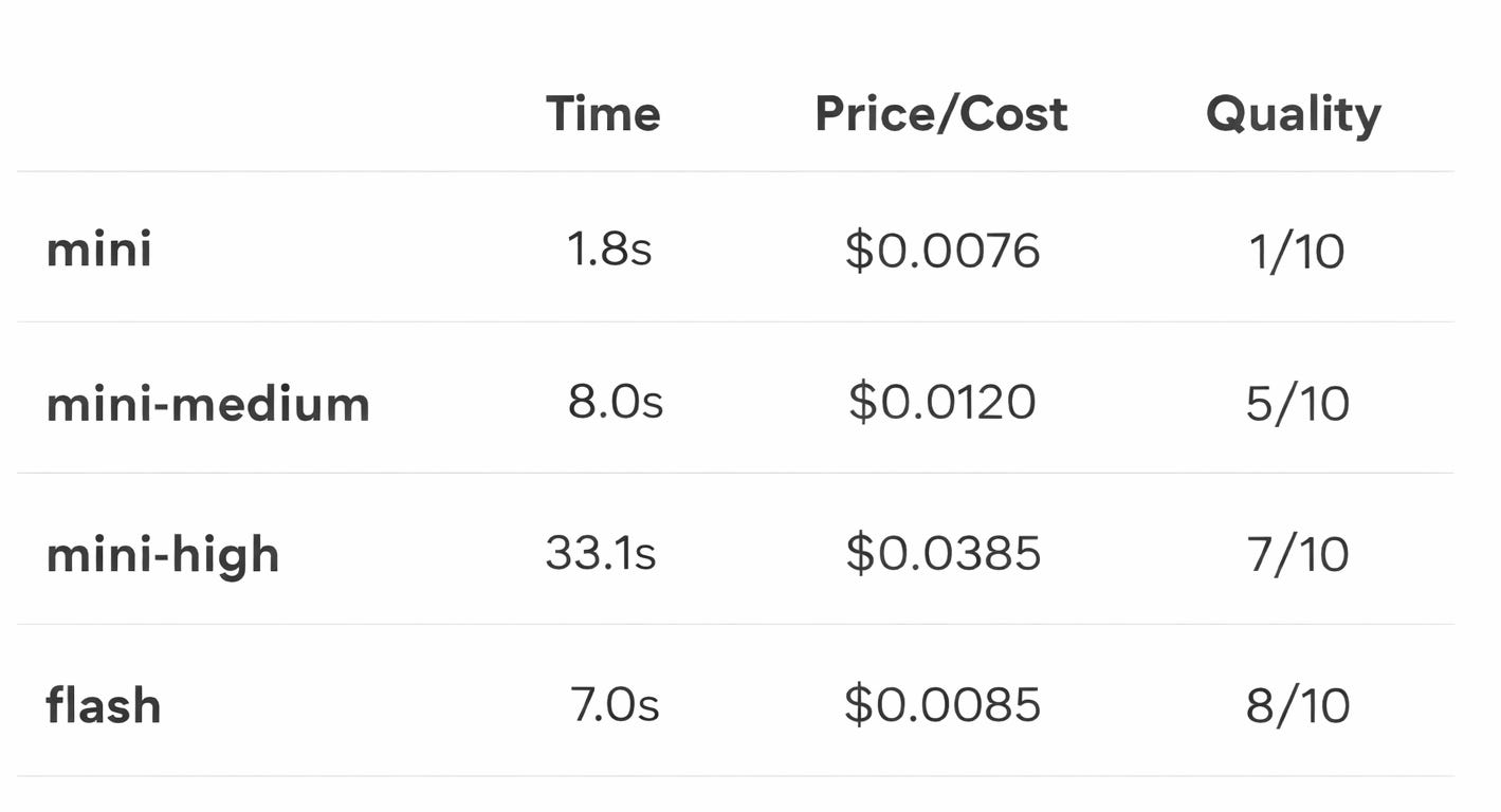 flashproduced the best overall resultminiwas extremely fast, but the quality was too low for this taskmini-mediumimproved onmini, but was still not reliable enoughmini-highgot much closer on quality, but with a significant latency cost